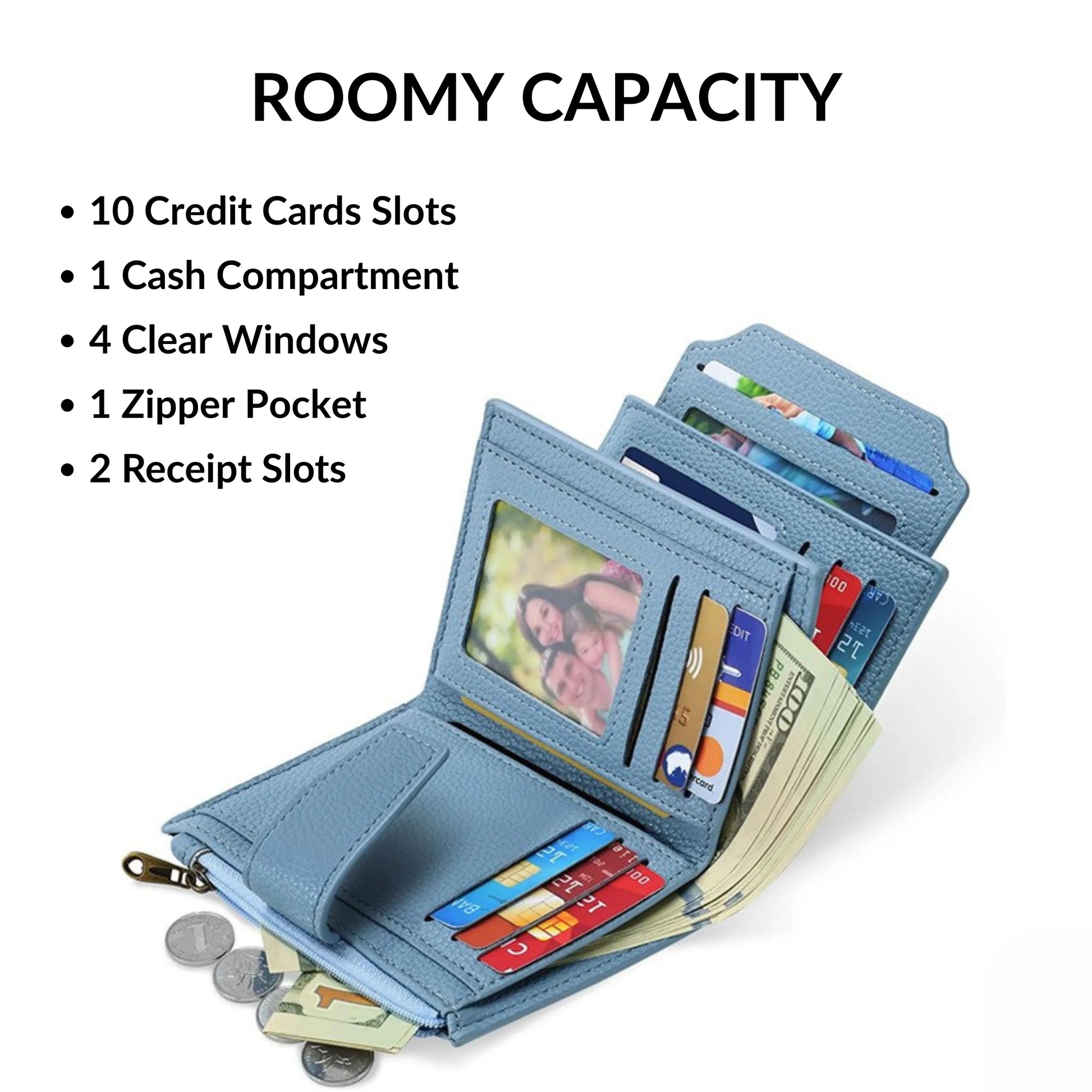Lucia holds 10+ cards, thanks to RFID slots, slip pockets, and removable ID windows. It also includes: